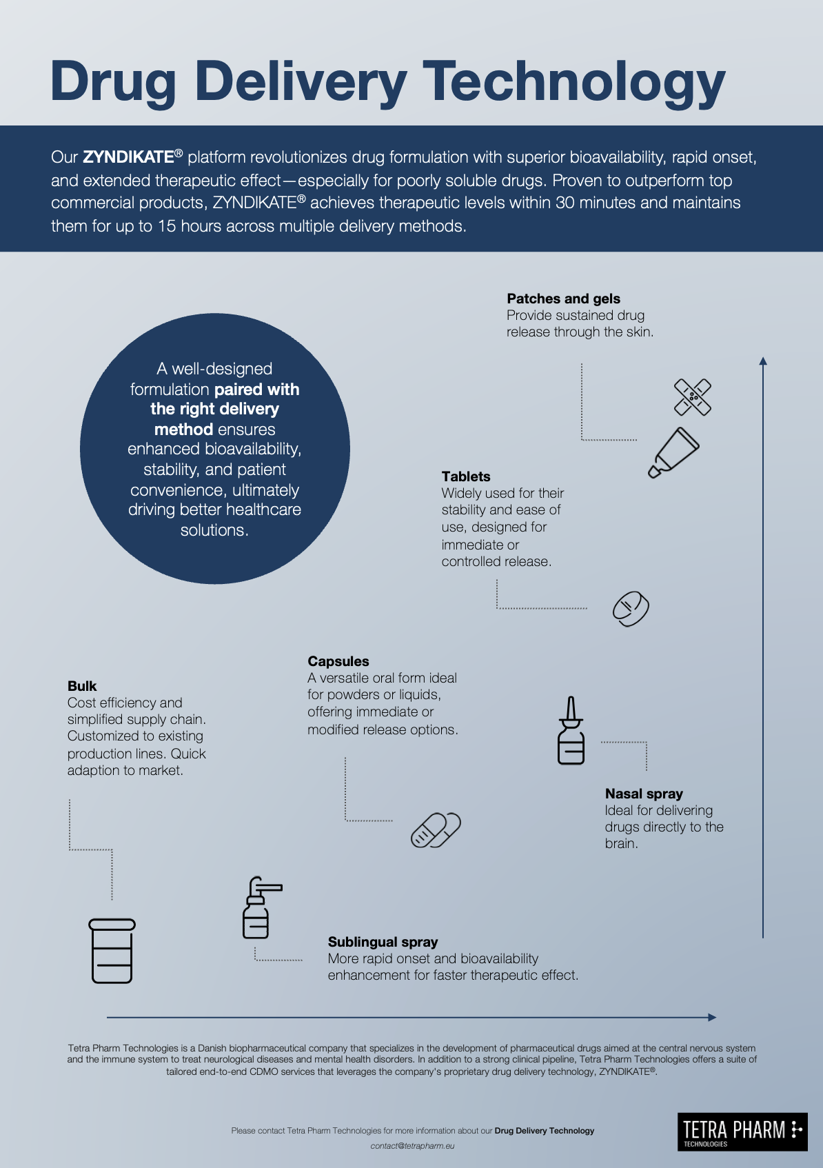 Our contract development and manufacturing services (CDMO) cover every stage from product development to full-scale GMP production and commercialization. To this end, we offer the drug delivery systems of ZYNDIKATE® to clients dealing with difficult-to-formulate (poorly soluble) compounds or with a strategic desire to strengthen a product’s lifecycle. Our ZYNDIKATE® platform, tailored to support various routes of administration, revolutionizes drug delivery with enhanced uptake and bioavailability.